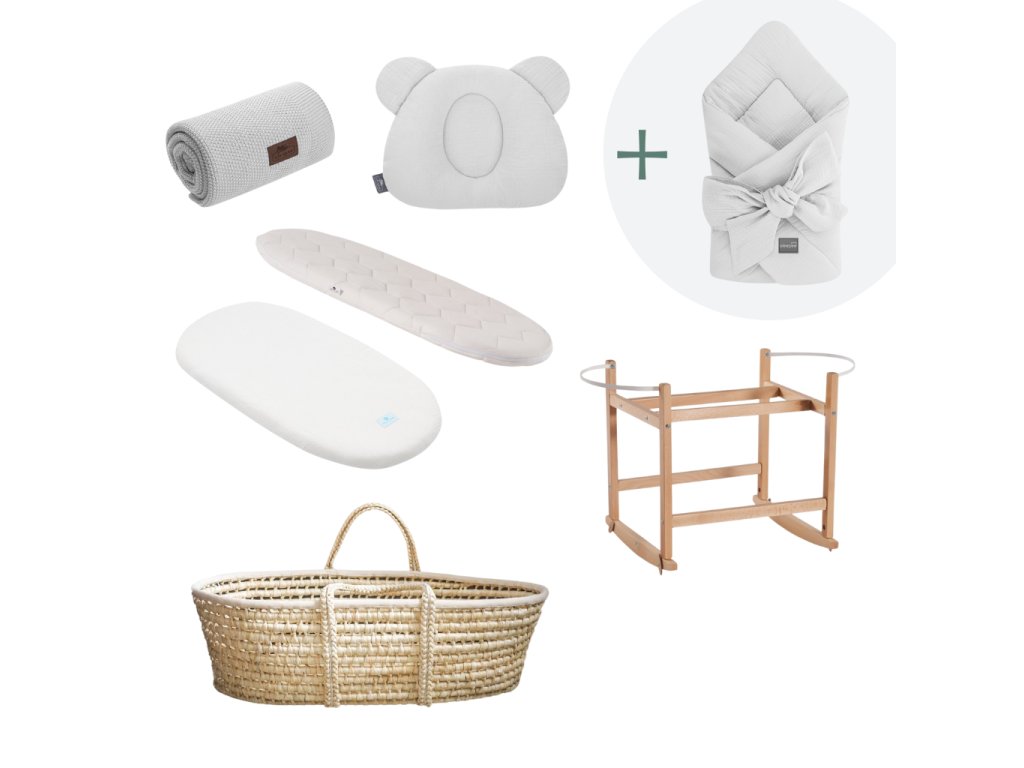 Výhodná mušelínová sada s košíkem pro novorozence se zavinovačkou ZDARMA! Obsahuje Mojžíšův košík pro miminko včetně matrace, prostěradlo ze 100% mušelínové bavlny, houpací stojan, fixační polštářek, bambusovou deku a mušelínovou zavinovačku zdarma. Sadu pro novorozence využijete pro denní i noční spánek miminek. Sada je vhodná zejména pro miminka narozená v jarních a letních měsících, ale lze ji využít po celý rok.