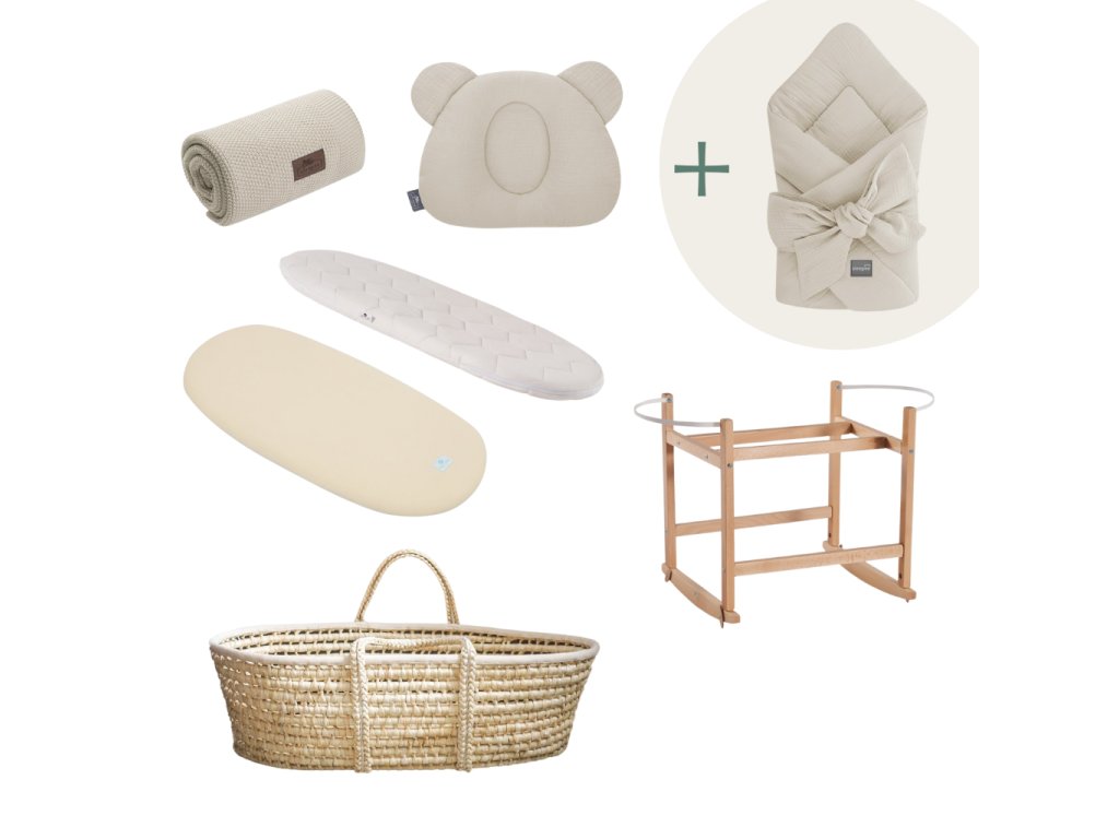 Výhodná mušelínová sada s košíkem pro novorozence se zavinovačkou ZDARMA! Obsahuje Mojžíšův košík pro miminko včetně matrace, prostěradlo ze 100% mušelínové bavlny, houpací stojan, fixační polštářek, bambusovou deku a