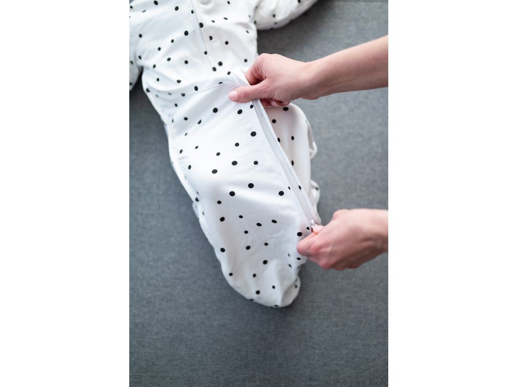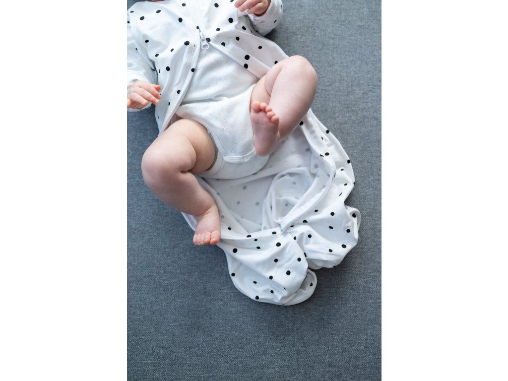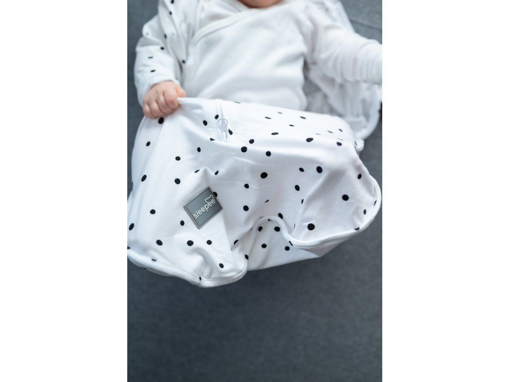 Schlafsack Sleepee Third Step Swaddle Black Dots kombiniert die Vorteile eines traditionellen Swaddles mit Funktionalität und Sicherheit eines Schlafsacks. Er sieht aus wie ein klassischer Swaddle, funktioniert aber dank seiner Größe und seines speziellen Schnitts wie ein Schlafsack.