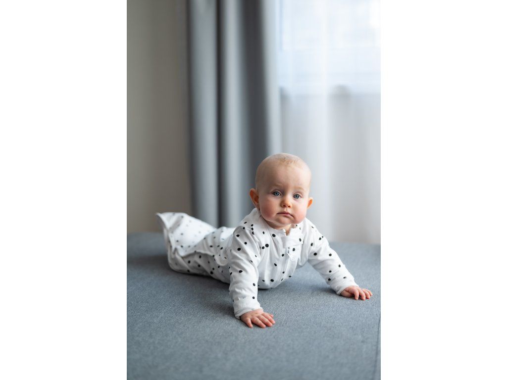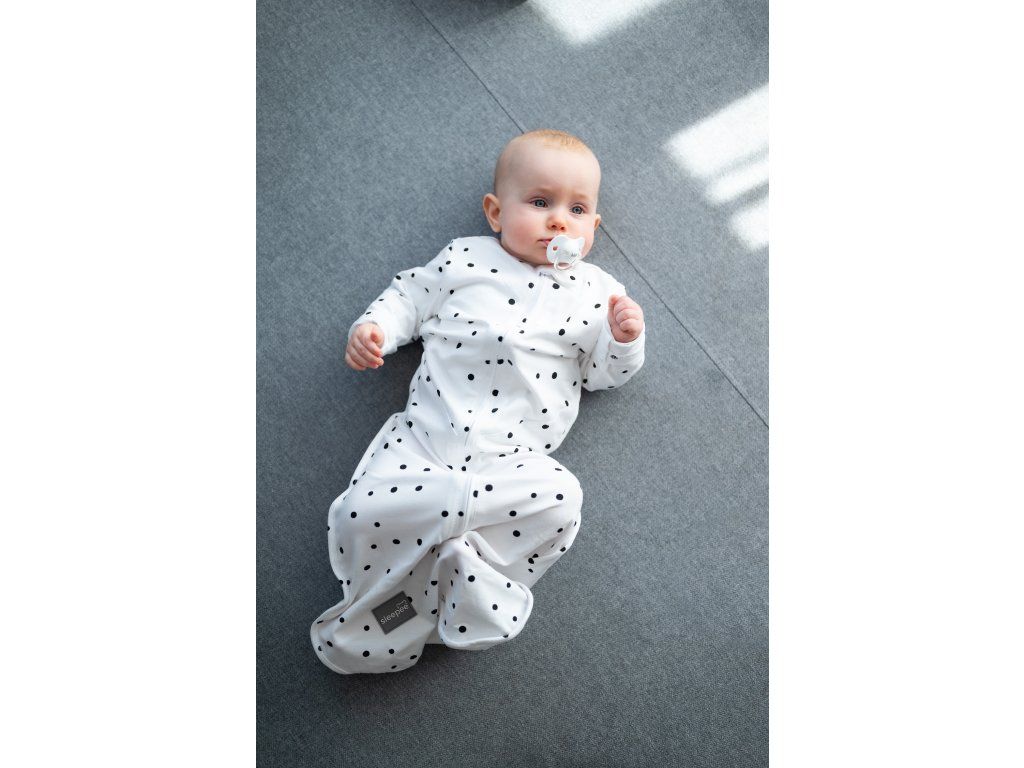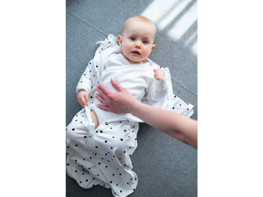 Der Schlafsack Dritter Schritt Sleepee Schwarze Punkte ist für Babys ab ca. 6 Monaten oder ab einem Gewicht von 7 kg geeignet. Er kombiniert die Vorteile und den Komfort eines Pucktuchs mit der Sicherheit eines Schlafsacks. Er hat einen TOG-Wert von 1.0 und ist für Temperaturen von 20-27 Grad geeignet. Ideal für Frühling, Sommer und ganzjährigen Gebrauch.