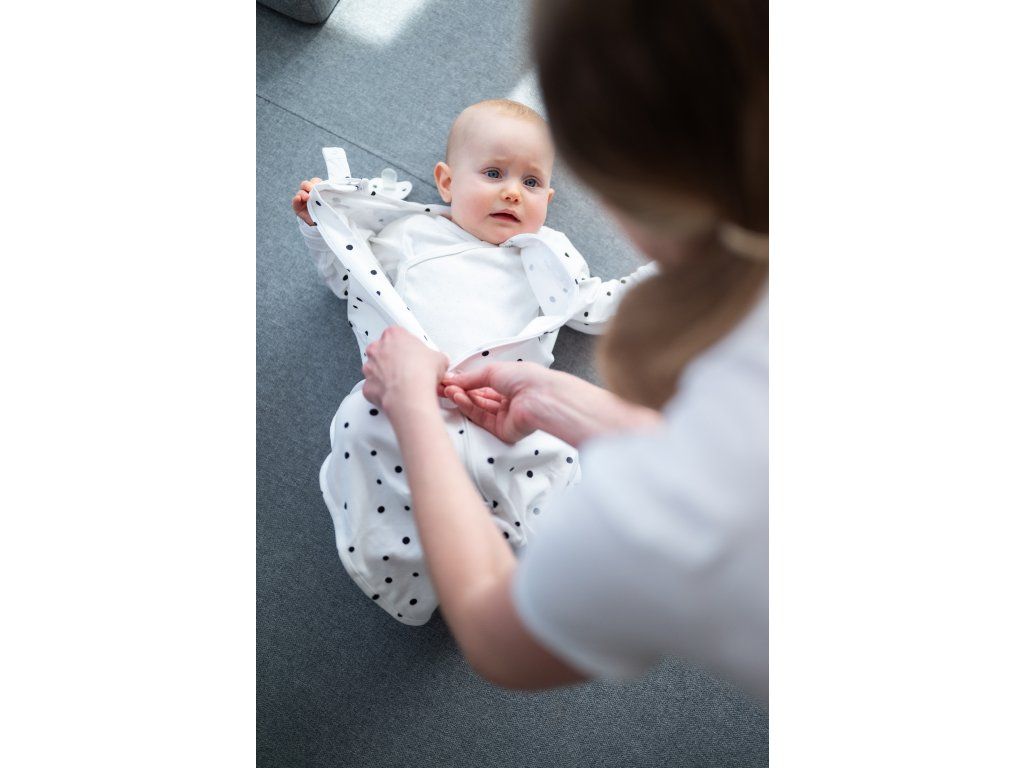 Der Schlafsack ist mit einem Reißverschluss ausgestattet, sodass das Baby leicht angezogen und nachts einfach gewechselt werden kann.