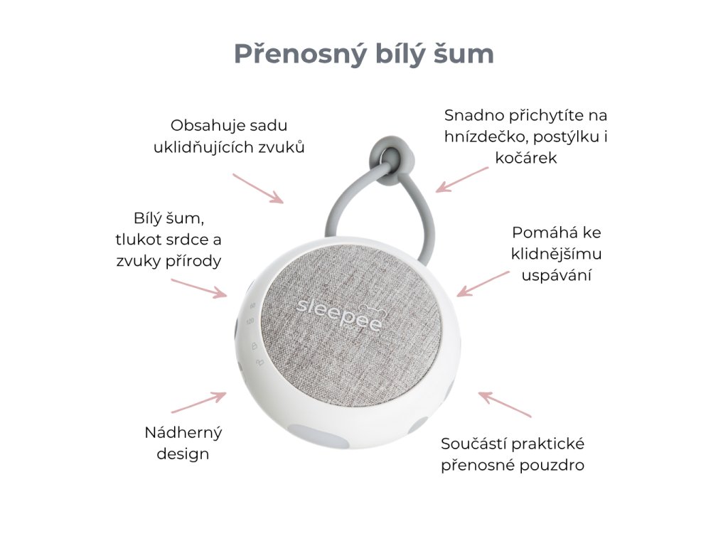 - Přenosný zvukový modul přehrávající bílý šum, tlukot srdce a zvuky deště a přírody pro klidné uspávání.